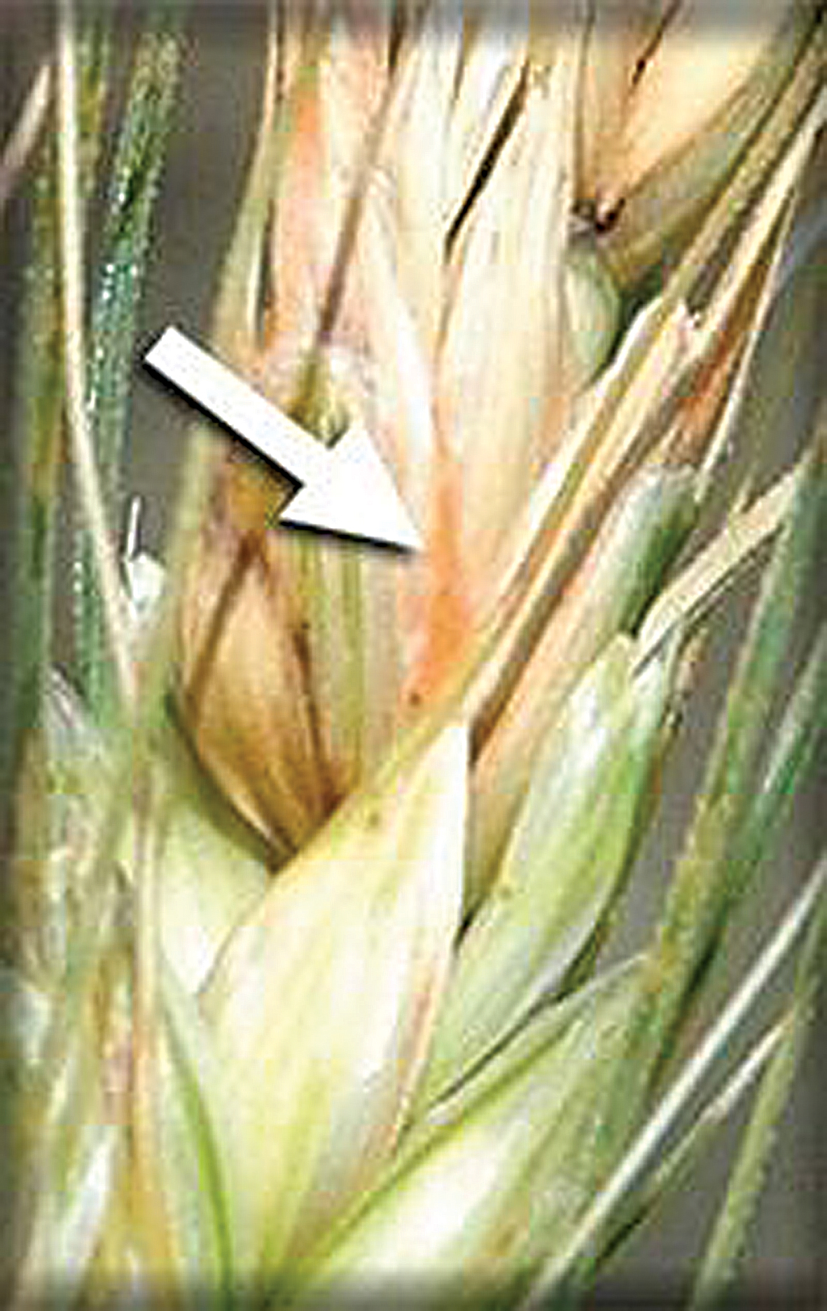 U vla­žnim uslo­vi­ma, na za­ra­že­nim kla­so­vi­ma se mo­že ja­vi­ti cr­ven­ka­sta ili ru­ži­ča­sta mi­ce­lij­ska na­vla­ka. Ta­kvi kla­so­vi za­kr­žlja­ju, a za­ra­že­na zr­na su la­ga­na, si­vo mr­ke bo­je, nji­hov sa­dr­žaj po­sta­je bra­šnast.