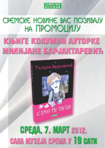 Dana 7.3.2012. u sali Muzeja Srema biće održana promocija knjige kolumni autorke Milijane Barjaktarević, koje su objavljivane u Sremskim novinama od 2009. do 2012. Izdavač Sremske novine i autorka Vas srdačno pozivaju da prisustvujete promociji.