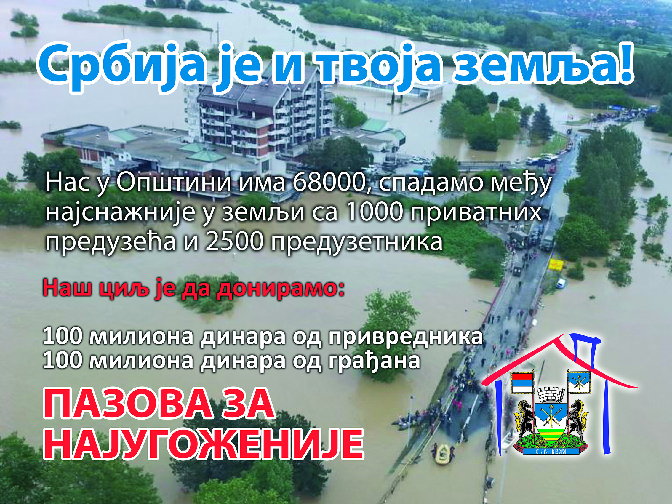 Stara Pazova – U utorak, 27.maja u podne u skupštinskoj sali Bele zgrade u Staroj Pazovi održava se prvi donatorski skup na kome će biti predstavljen projekat „Srbija je i tvoja zemlja, Pazova za najugroženije“. Udruženje privrednika, preduzetnika i građana staropazovačke opštine pokrenulo je inicijativu za jedan snažan i sveobuhvatan projekat koji je namenjem sanaciji posledica katastrofalnih poplava kroz restauraciju, obnovu i izgradnju stambenih objekata širom Srbije.