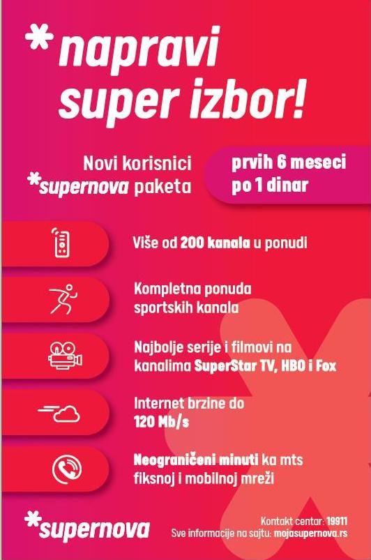 Sve nove korisnike koji se odluče za *supernova pakete očekuje atraktivna promocija – šest meseci u toku kojih će njihova pretplata iznositi jedan dinar mesečno.