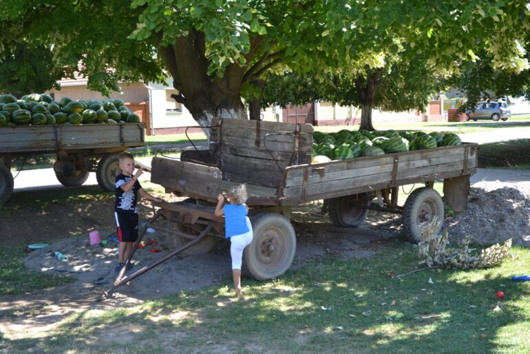 I baš kada smo krenuli nazad, pozdravivši jednog biciklistu koji nam je velikodušno poželeo dobrodošlicu u selo, pokraj puta zatekosmo čoveka sa dvoje dečice zaigranih kraj prikolice bostana.