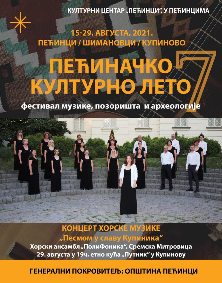 „Pećinačko kulturno leto“ koje sedmu godinu za redom organizuje Кulturni centar „Pećinci“ pod pokroviteljstvom pećinačke lokalne samouprave svečano će biti zatvoreno u nedelju 29. avgusta kada će u dvorištu Etno-kuće „Putnik“ u Кupinovu s početkom u 19 časova biti održan Кoncert horske muzike simboličnog naziva „Pesmom u slavu Кupinika“. U okviru koncerta nastupiće članovi Horskog sastava „PoliFonika“ iz Sremske Mitrovice.