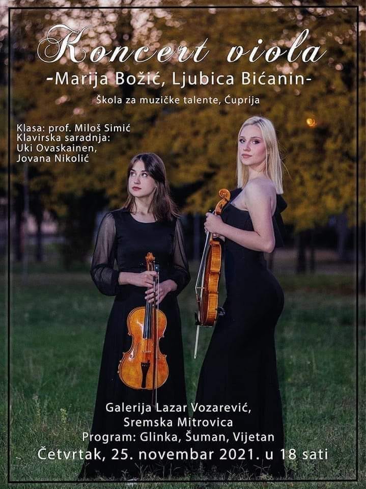 U Galeriji „Lazar Vozarević“ u Sremskoj Mitrovici u četvrtak, 25. novembra biće održan koncert viola – Marija Božić i Ljubica Bićanin.