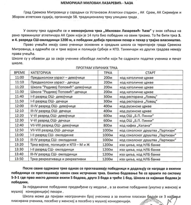 Grad Sremska Mitrovica u saradnji ustanovom Atletski stadion, atletskim klubovima “Srem” i “Sirmium” i Zborom atletskih sudija u ponedeljak, 22. novembra organizuje 58. tradicionalne Ulične trke.