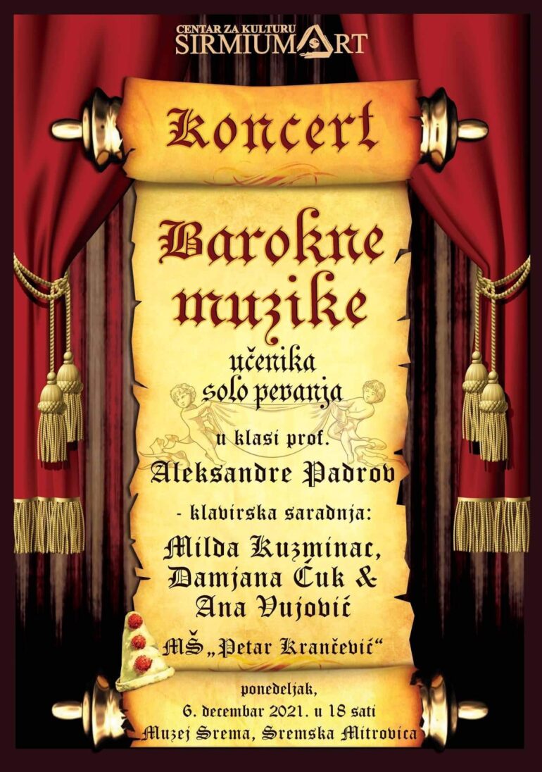 Koncert barokne muzike učenika solo povanja Muzičke škole „Petar Krančević“ u klasi prof. Aleksandre Padrov biće održan u ponedeljak, 6. decembra u Muzeju Srema u Sremskoj Mitrovici.