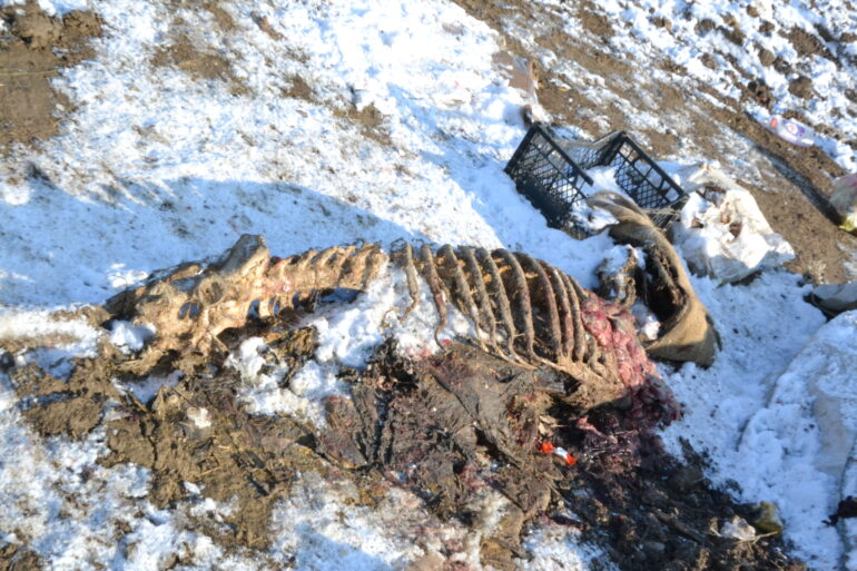 Pored svinje, kao u vesternima, samo ne na pesku, već na zaleđenoj zemlji, ležao je i jedan kostur. Telo omanjeg teleta ili poveće koze (teško je razaznati), poslužilo je kao hrana glodarima i grabljivicama koje ordiniraju fruškogorskim nebom, a od njega je, osim kostiju, ostalo i krzno.