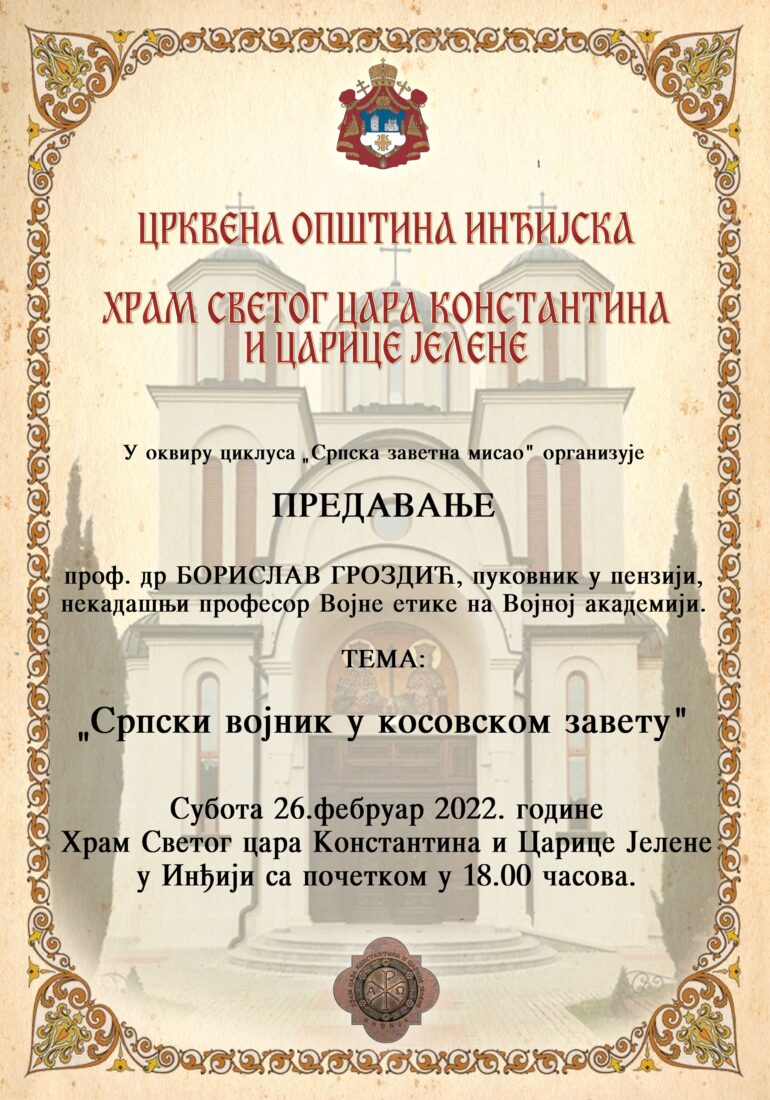 Drugo predavanje iz ciklusa „Srpska zavetna misao“ u hramu Svetog cara Кonstantina i carice Jelene u Inđiji biće održano na subotu 26. februara sa početkom u 18.00 časova. Na temu „Srpski vojnik u kosovskom zavetu“ govoriće prof. dr Borislav Grozdić, pukovnik u penziji, nekadašnji profesor Vojne etike na Vojnoj akademiji.