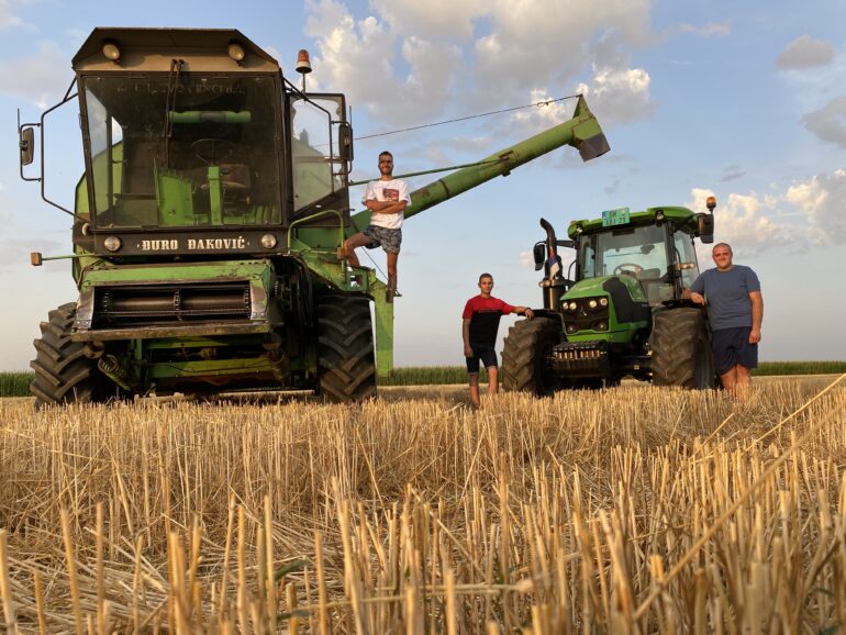 Zemlju radi već 24 godine, uglavnom samo svoju, svojom mehanizacijom. Nalazimo ga u četvrtak u suton na njivi, kraj kombajna sa komšijom, Domonji Miroslavom, koji mu je pomagao. Iako je bilo blizu 9 sati uveče temperatura je bila iznad 30 stepeni.