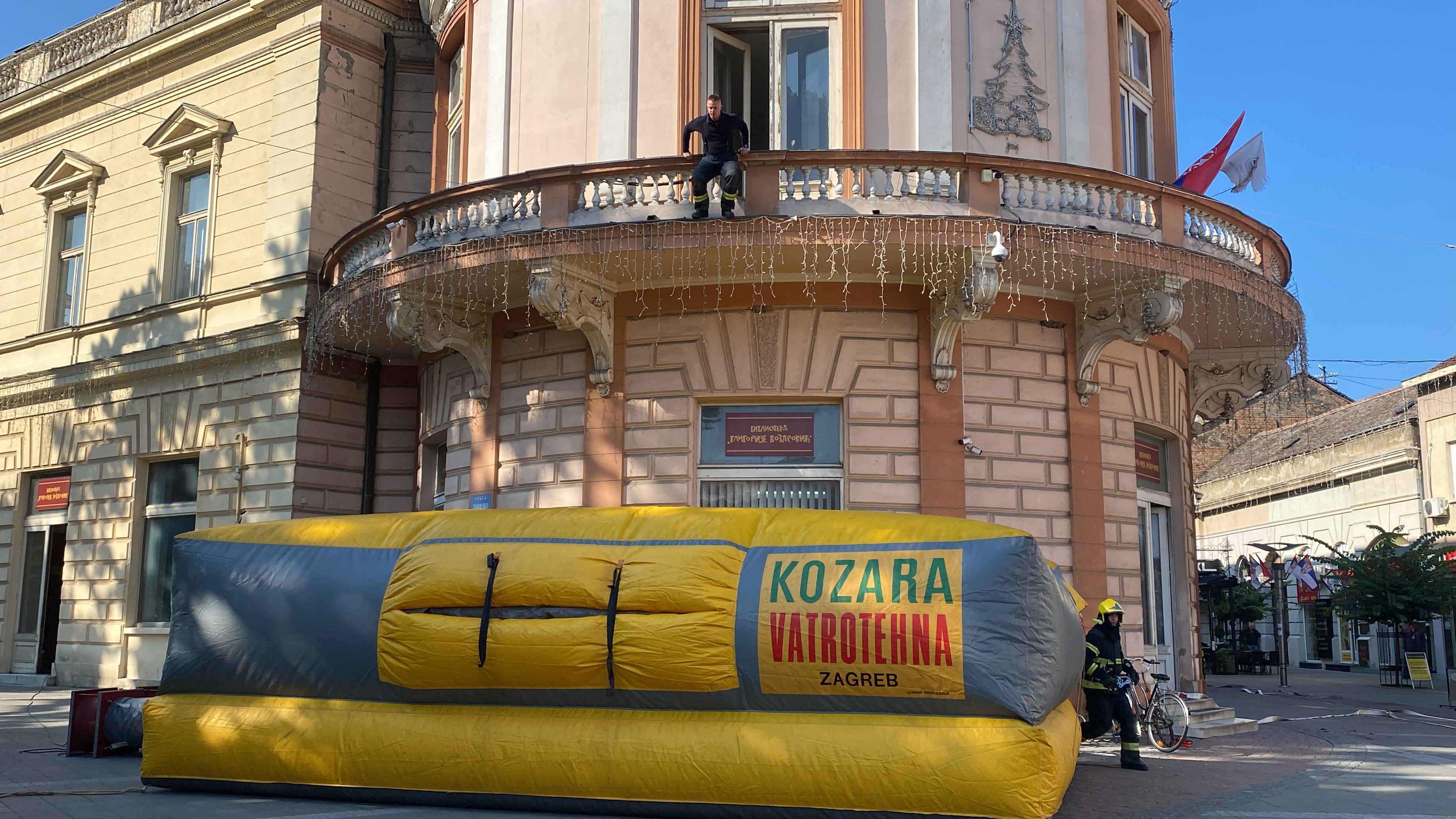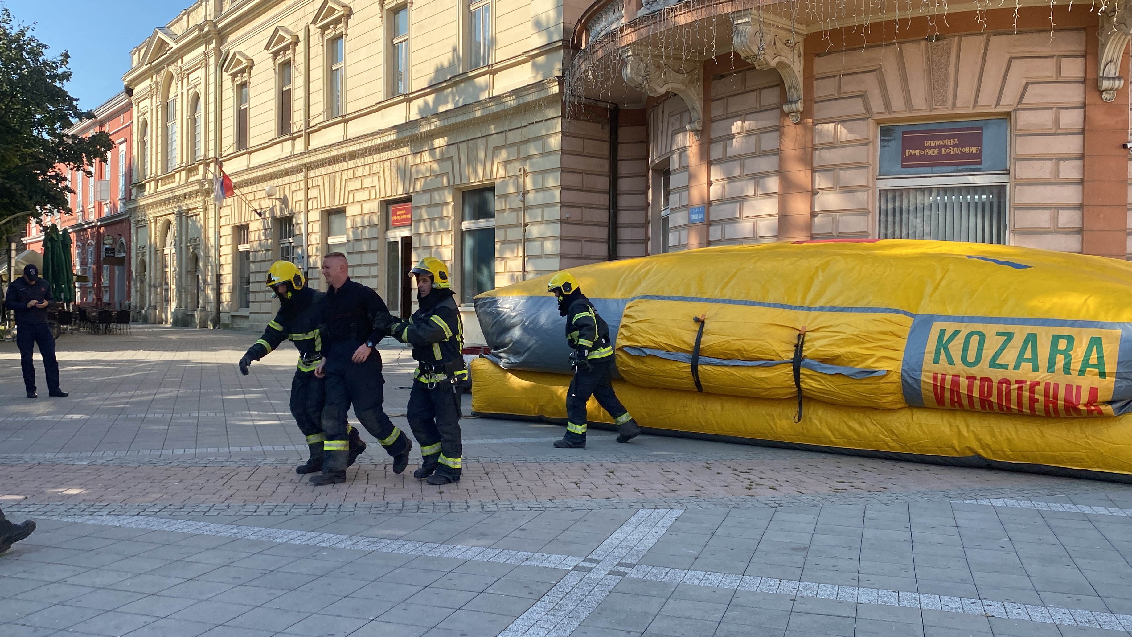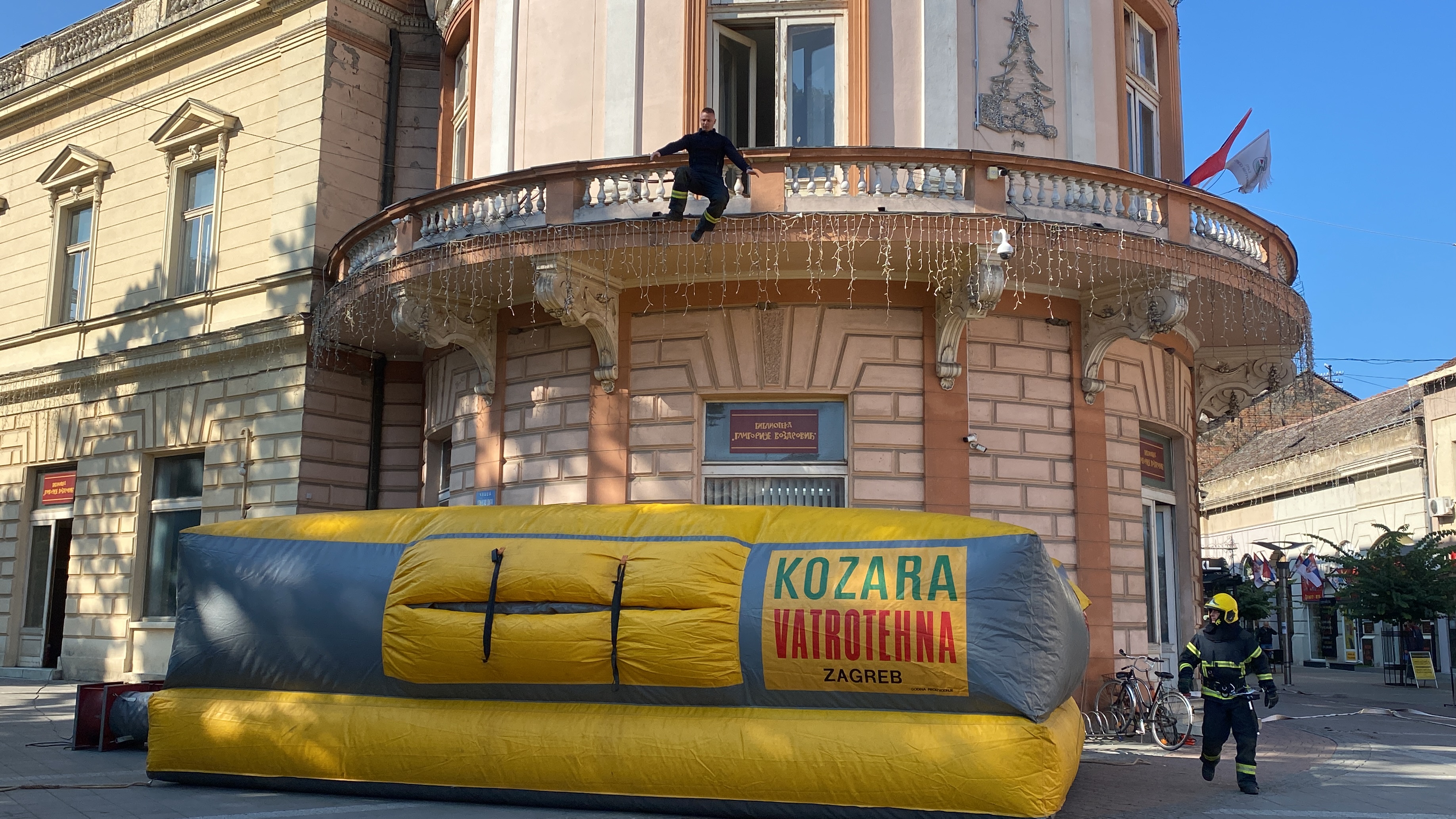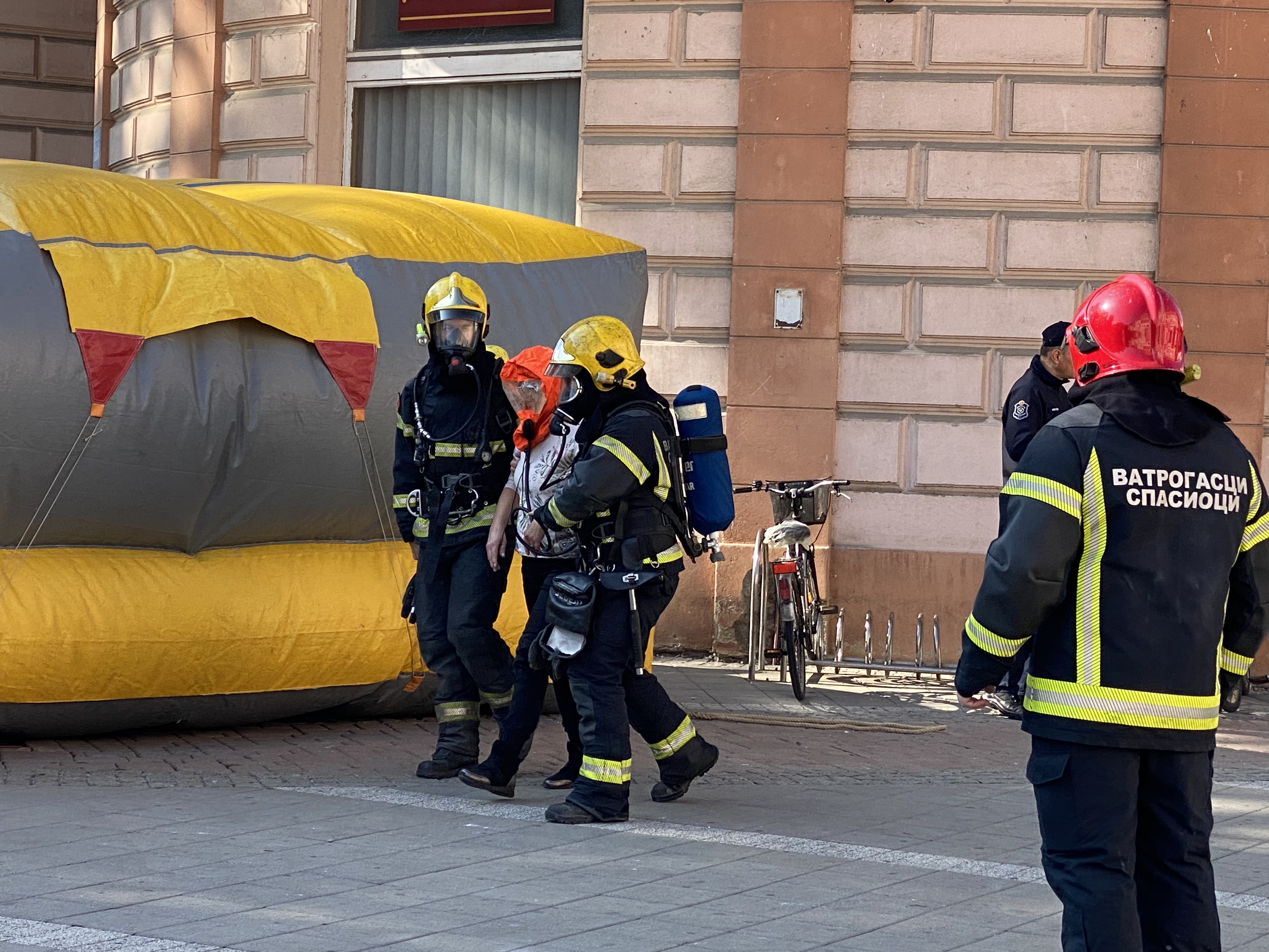 U okviru vežbe izvršena je simulacija gašenja požara u prostorijama biblioteke – evakuacija jednog ugroženog lica iz prizemlja i dva lica sa sprata objekta iz pomoć vazdušnog jastuka.