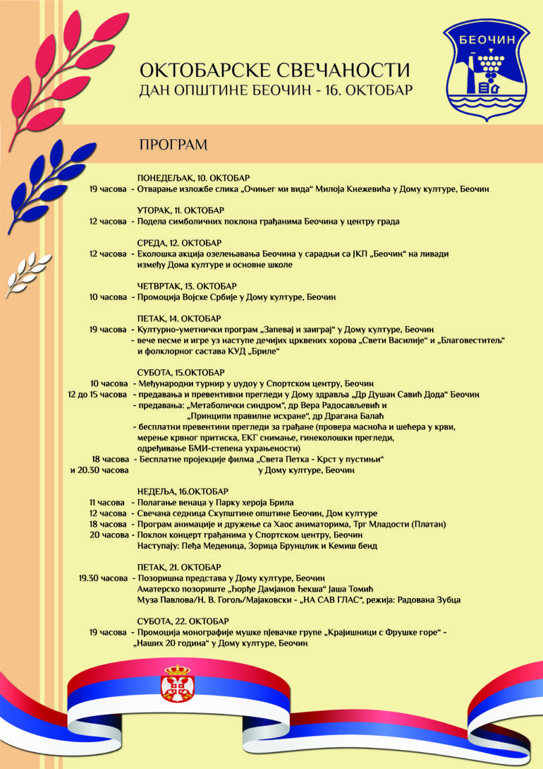 Svi programi u okviru Oktobarskih svečanosti Opštine Beočin su besplatni.