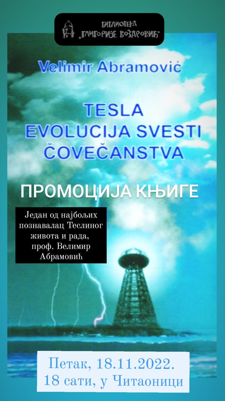 U petak, 18. novembra sa početkom u 18:00 časova biće održana promocija knjige „Tesla, evolucija svesti čovečanstva“ prof. Velimira Abramovića.
