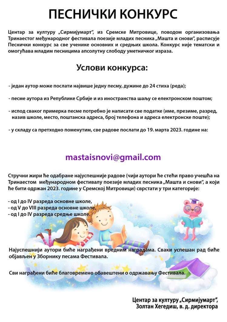 Centar za kulturu „Sirmiumart” iz Sremske Mitrovice, povodom organizovanja 13. Međunarodnog festivala poezije mladih pesnika „Mašta i snovi”, raspisuje Pesnički konkurs za sve učenike osnovnih i srednjih škola. Konkurs nije tematski i omogućava mladim pesnicima apsolutnu slobodu umetničkog izraza.