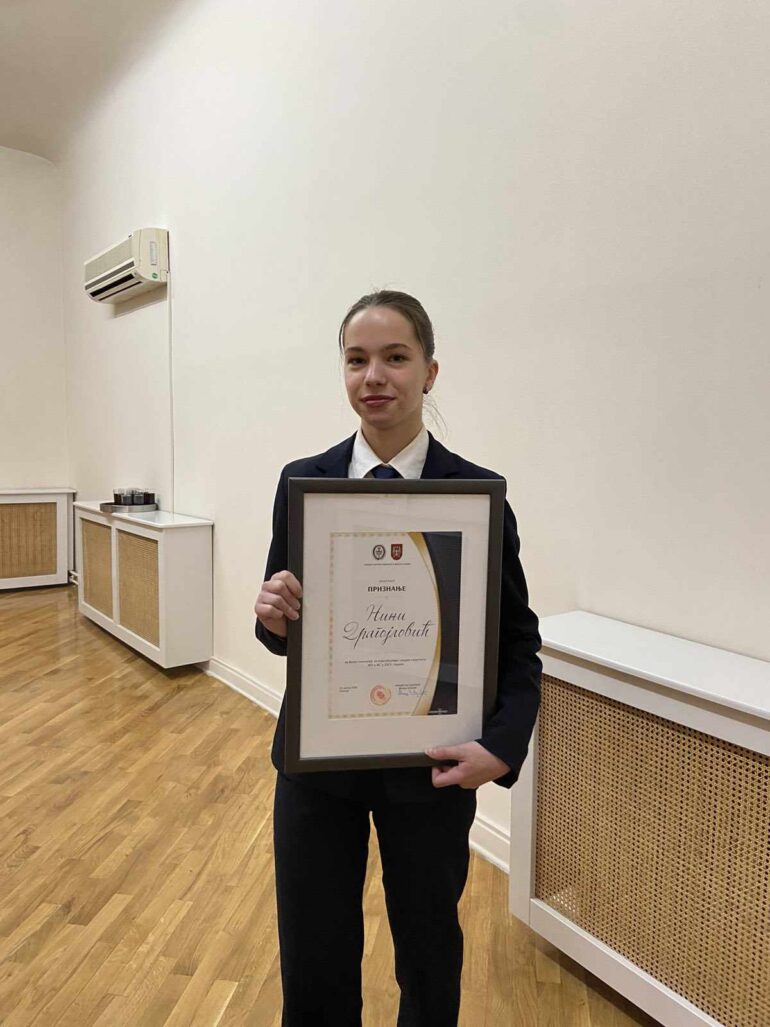 Članicu Karate kluba Sirmijum iz Sremske Mitrovice uspesi na državnim i regionalnim takmičenjima dovela su do ovog priznanja. Dva pehara za najuspešniju takmičarku i šest zlatnih medalja na Prvenstvu Srbije bili su dostignuća koja su najviše vrednovana. Na svakom takmičenju osvajala je zlatne medalje i činila sebe i načelnika klase ponosnim. Ambicija u narednom periodu ne manjka, a Nina ne krije zadovoljstvo školovanjem u Vojnoj gimnaziji.