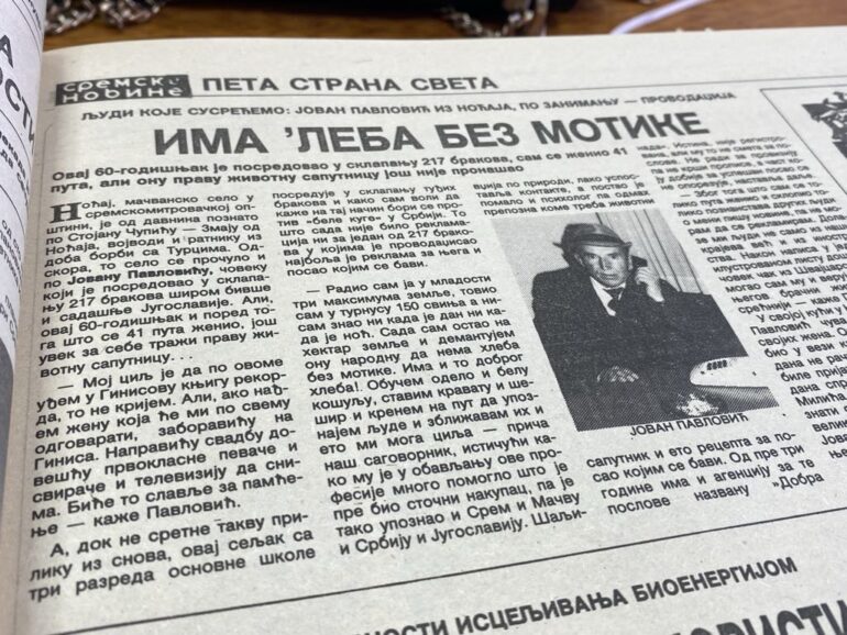 -Zbog toga što sam se toliko puta ženio i sklopio toliko poznanstava drugih ljudi o meni pišu novine, pa ne moram da se reklamiram. Dolaze mi ljudi ne samo iz naših krajeva već i iz inostranstva. Nakon napisa u jednom ilustrovanom listu došao mi čovek iz Švajcarske. Pomogao sam mu i verujem da je njegov bračni život sada srećniji – kaže Pavlović.