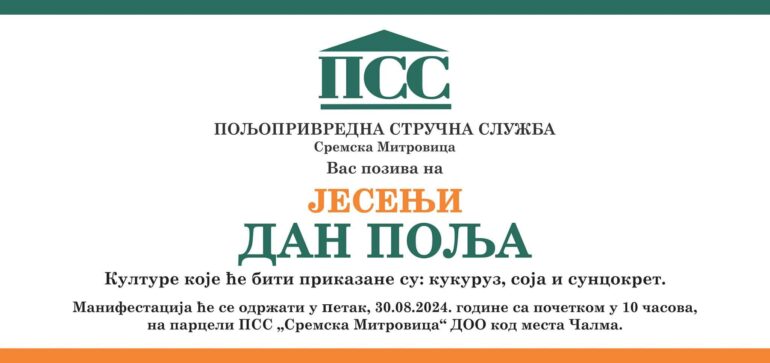 Jesenji “Dan polja” u organizaciji Poljoprivredne stručne službe Sremska Mitrovica biće održan u petak, 30. avgusta sa početkom u 10:00 časova.