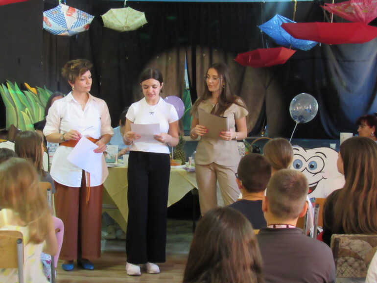 Mnogobrojna publika, koju su činili nagrađeni učenici i predškolci, roditelji i nastavnici, imala je priliku da odgleda pozorišnu predstavu „Ana u zemlji kišobrana“ koju su pripremili i još bolje izveli učenici „Popovićeve“ škole.