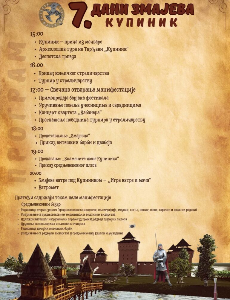 U 18.00 časova biće predstavljen „Zmajevac“ – zavetni mač čuvara Kupinika, nakon čega će uslediti viteške borbe i dvoboji. Od 19.00 časova planirano je predavanje „Znamenite žene Kupinika“ i prikaz srednjovekovnih plesova.