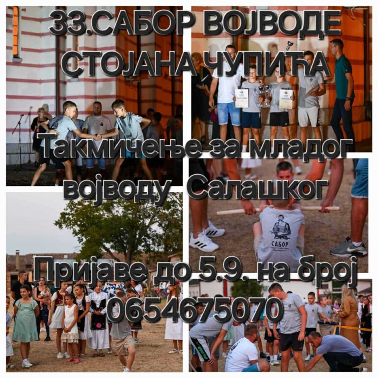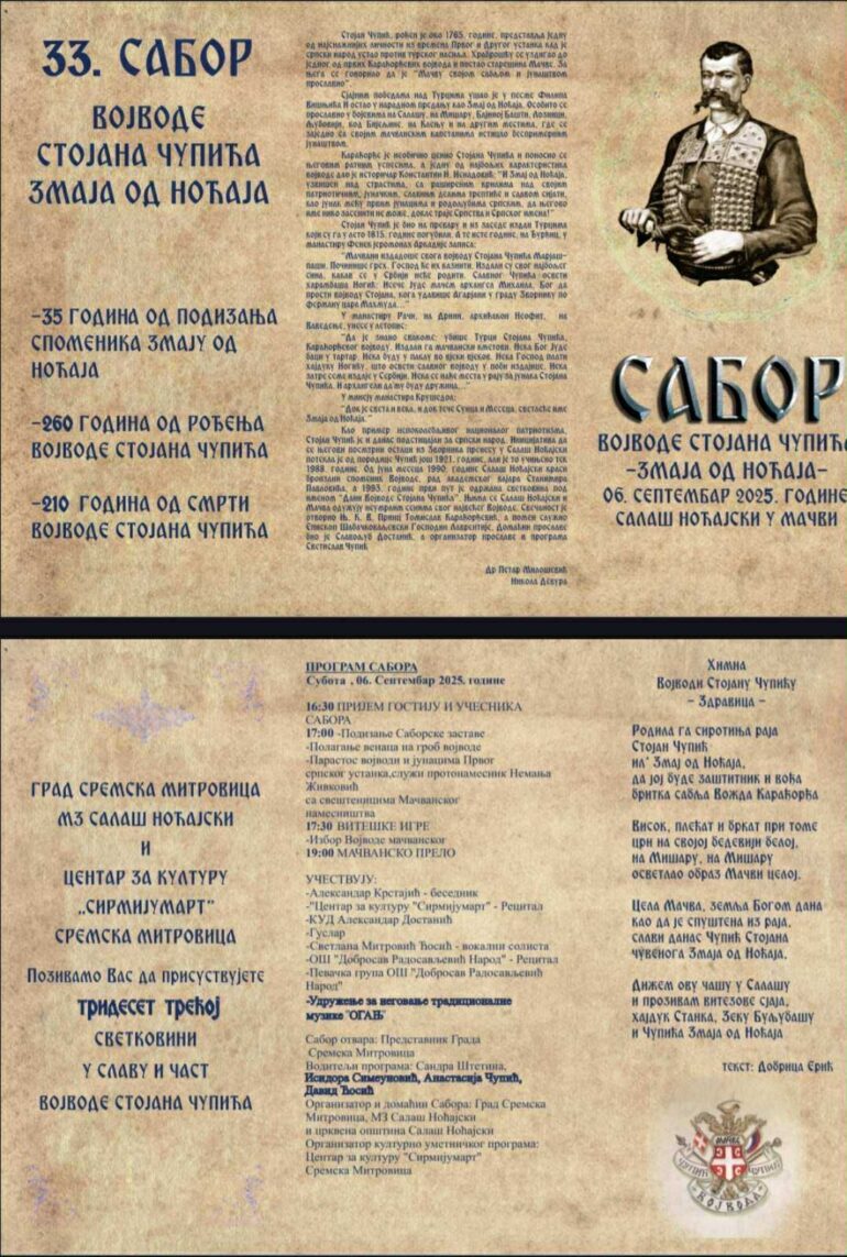 Tradicionalni, 33. Sabor u slavu i čast vojvode Stojana Čupića – Zmaja od Noćaja biće održan u subotu, 6. septembra, u porti hrama Svetog velikomučenika Georgija u Salašu Noćajskom.