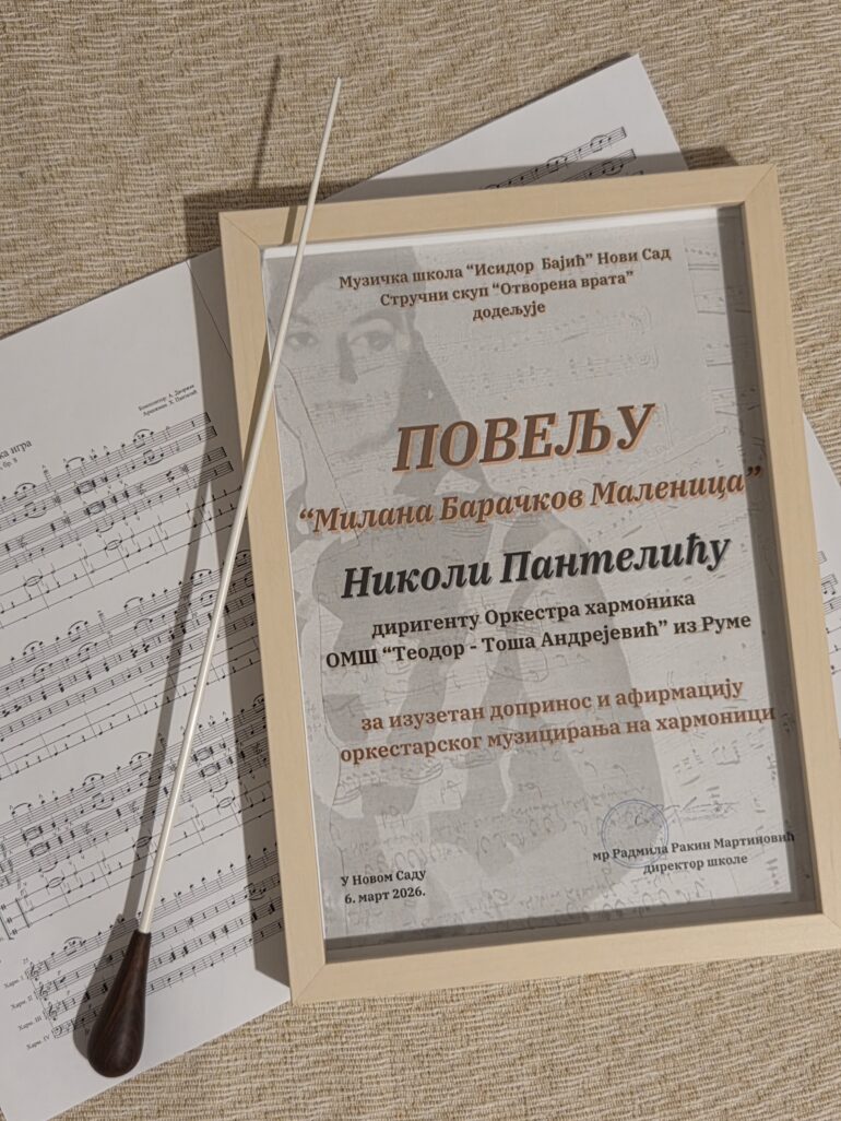 Na Koncertu orkestara harmonika, nedavno održanom u Gradskoj koncertnoj dvorani u Novom Sadu povodom svečanog zatvaranja Stručnog skupa „Otvorena vrata harmonike“, u organizaciji Muzičke škole „Isidor Bajić“ iz Novog Sada, predstavljen je i Orkestar harmonika Osnovne muzičke škole „Teodor-Toša Adrejević“. Tom prilikom dirigentu Nikoli Panteliću uručena je Povelja „Milana Baračkov Malenica“ kao priznanje za izuzetan doprinos razvoju i afirmaciji orkestarskog muziciranja na harmonici. „Ova povelja je podstrek za dalji umetnički rad, ali i potvrda da su trud i ljubav prema muzici iznad svega.“, istaknuto je prilikom uručenja priznanja.